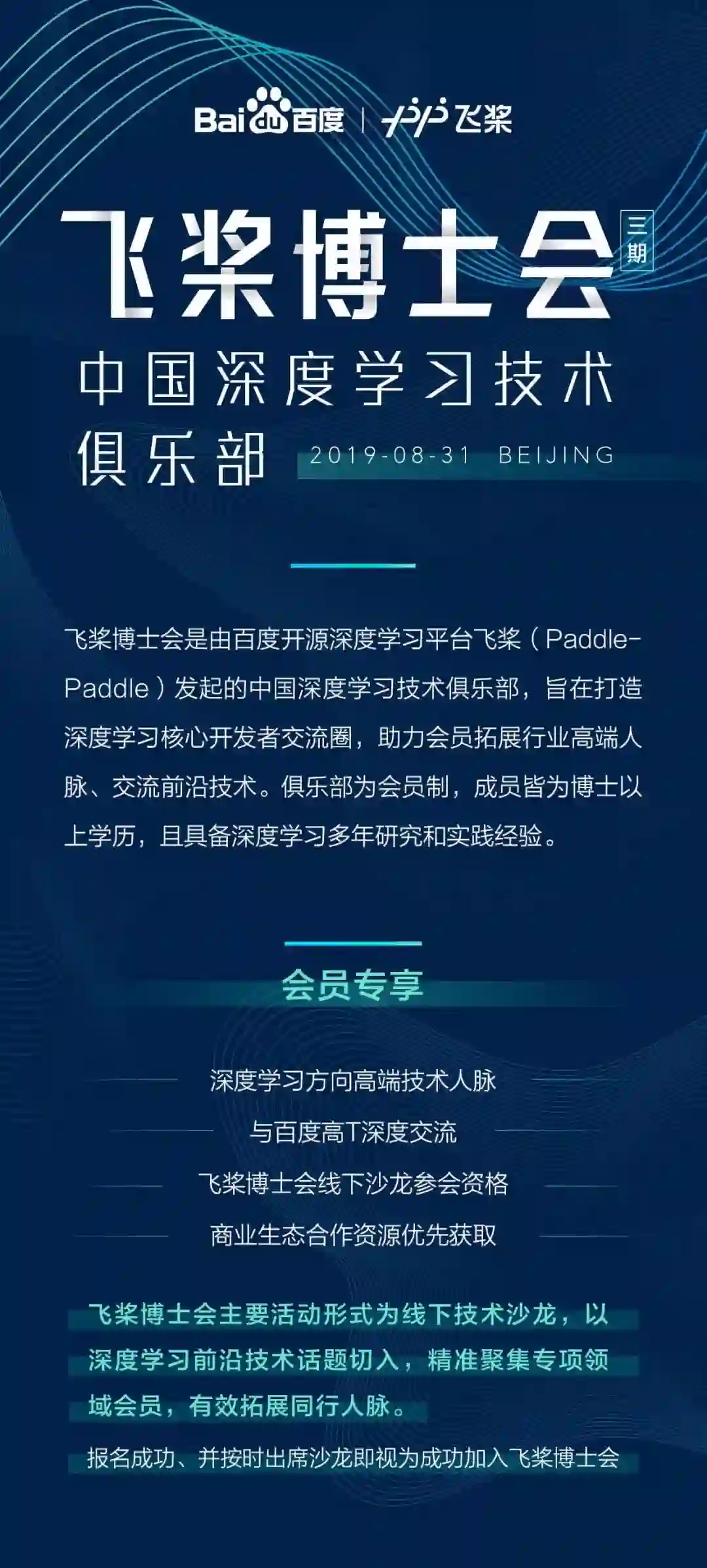 飞桨博士会是由百度开源深度学习平台飞桨(PaddlePaddle)发起的中国深度学习技术俱乐部,旨在打造深度学习核心开发者交流圈,助力会员拓展行业高端人脉、交流前沿技术。俱乐部为会员制,成员皆为博士生导师或博士,且具备深度学习多年研究和实践经验。