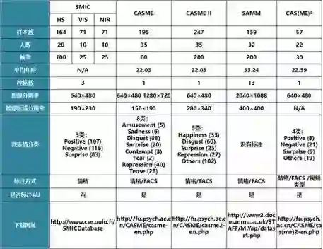另外5个数据集,CASME、CASME II、CAS(ME)2是中国科学院心理研究所傅小兰团队所建立,SMIC是由芬兰奥鲁大学赵国英团队建立。各个数据集的细节如下表所示: