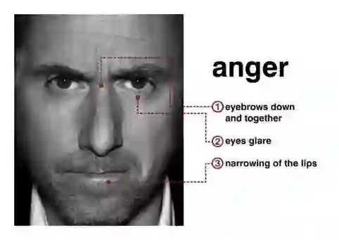 例如人们在愤怒时,眉毛会紧皱下垂,眼睑和嘴唇紧张: