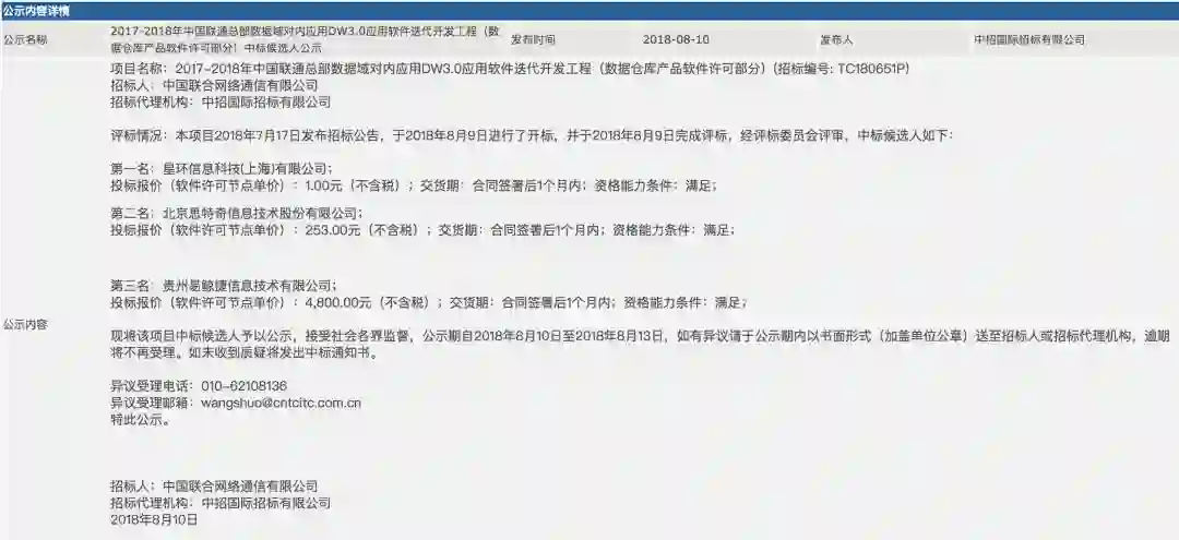 2017-2018年中国联通总部数据域对内应用DW3.0应用软件迭代开发工程(数据仓库产品软件许可部分),项目预算金额:1.16万元/节点。最近对外公示中标候选人,中标结果公示:星环科技、思特奇、易鲸捷投标价格分别为 1元/节点、253元/节点、4800元/节点。也就是最多464万元的项目,星环科技400元中标。