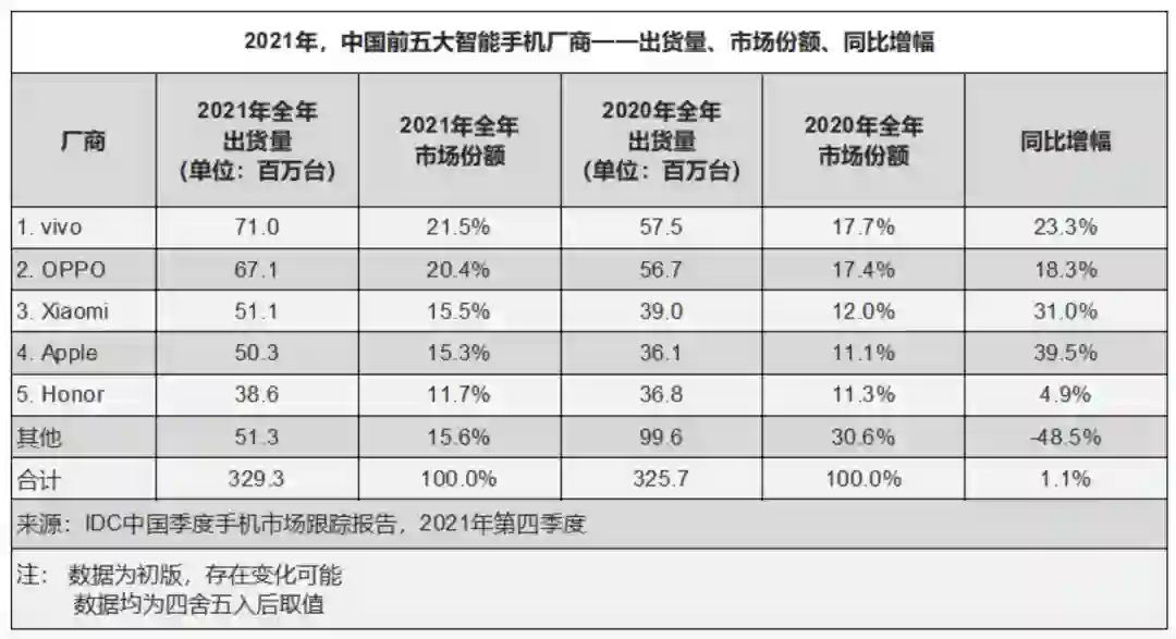 那么,vivo为什么要自研双芯系统?这还得从最本质问题入手:为什么要自研芯片?要知道,这种烧钱又费力的事搁在几年前,国内手机厂商根本不会感兴趣,那么为啥现在都纷纷入场了呢?一方面,在当下这个国际大环境,芯片产业作为科技行业的高端产业,一直以来都被欧美国家霸占。再加上华为近年来接连被美国打压,让大众更加认识到自研芯片的重要性。如果自己手中没有研发的芯片,那么一但国外厂商断供,后果将不堪设想。 另一方面,「软硬兼施」其实是每家公司都要考量的因素,苹果就是一个典型的例子。这家公司从一开始便专注于软件和硬件的统一,而非先有鸡还是先有蛋的问题。直白来讲,苹果的软硬件从研发阶段就是整合一体的。苹果自研M1芯片不仅仅在MacBook,也在新款iPad Pro 2021上大获成功,其性能、功耗远远超出许多人的预期,就连M2都已经开始投产了。另外,IDC数据显示,2017年以来,全球智能手机出货量开始持续下滑。2021年,全球智能手机出货量为13.55亿台,同比增长5.7%,为近来首次增长。vivo在2021全年以21.5%的市场份额稳居中国市场第一,年出货量超7100万台,同比增长23.3%。图源:IDC尽管vivo手机的出货量已经名列前茅,但在自研芯片方面,直到今天,苹果、华为、三星都比其他手机厂商走得更远。对于vivo来说,没有理由止步不前。提起自研芯片,从广义上来讲,更多指的是SoC(系统级芯片)。这个微型系统就包括中央处理器(CPU)、图形处理器(GPU)、数字信号处理器(DPS)、存储器(ROM/RAM)、基带芯片(Modem)、图像处理器(ISP)以及神经处理单元(NPU)等元器件组成的集合。可以看到,SoC是一个更庞大更复杂的系统。研发SoC系统需要投入大量人力、物力、甚至是巨额的资金。而在短期之内,这些资源都是有限的。由简易芯片逐渐向更复杂芯片推动,对一家企业来讲无疑是最好的发展套路。上面提到的V1,以及升级后的V1+都是一种专用芯片ASIC(专用集成电路)。ASIC芯片是为了某种特定的需求而专门定制的芯片的统称,比如专用的音频、视频处理器。就vivo自身来讲,追求高影像的质量仅凭光学器件升级是不够的,当面对暗光场景、复杂光线等复杂因素,还是需要手机芯片进一步升级进化。再加上SoC系统已经有很多成熟的企业在做,vivo需要把资源聚焦到一个点,一个用户可以感知的点。而图像处理的专用ASIC芯片,就很容易被用户感知。当前,「一机双芯」将智能手机带入了一个全新的时代。在vivo率先推出了「双芯」系统之后,包括OPPO、荣耀等国内厂商也在这一赛道展开了布局。可见,像vivo等企业给手机加上了专用的影像芯片后,切切实实带了更加出色的拍摄体验。
