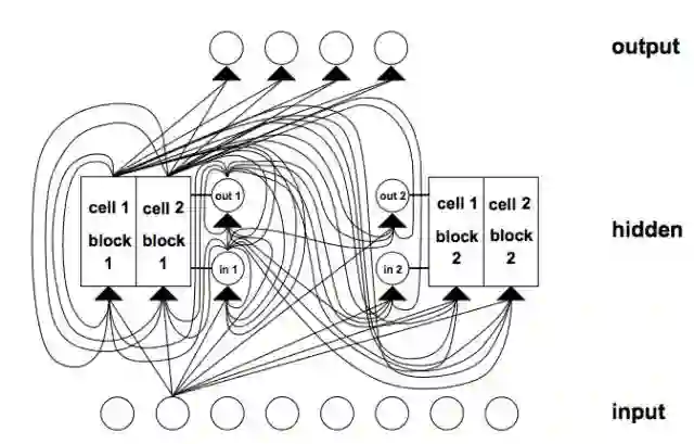 LSTM 架构示例。这个 LSTM 网络带有 8 个输入单元、4 个输出单元和 2 个大小为 2 的记忆单元模块。in1 是指输入门,out1 是指输出门,cell1 = block1 是指 block 1 的第一个记忆单元。来自 1997 年的《Long Short-Term Memory》