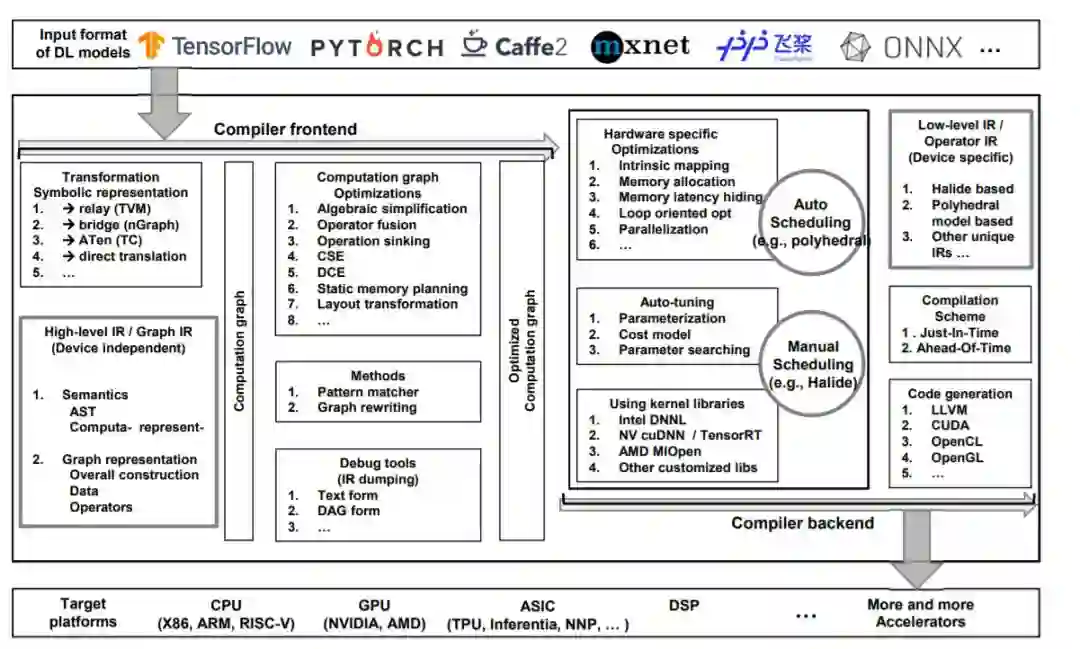 本文其余部分组织如下。第2节介绍DL编译器的背景,包括DL框架、DL芯片以及硬件(FPGA)特定的DL编译器。第3节详细比较了现有的DL编译器。第4节描述了DL编译器的总体设计,重点介绍了IR和前端/后端优化。第五部分是全文的总结,并对未来的研究方向进行了展望。