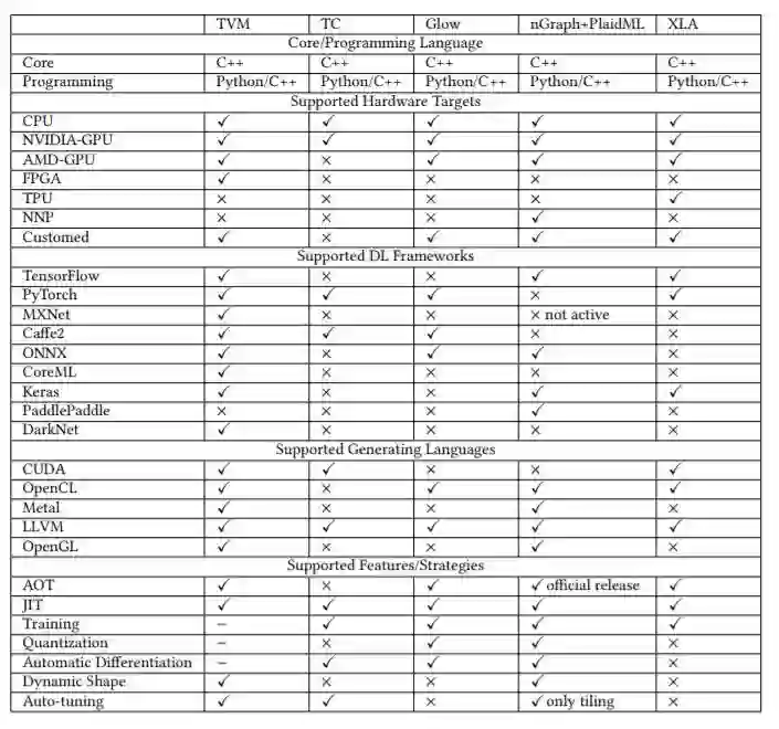 我们从硬件支持、DL框架支持、代码生成和优化等方面对现有的DL编译器进行了全面的比较,为最终用户选择合适的DL编译器提供了指导。