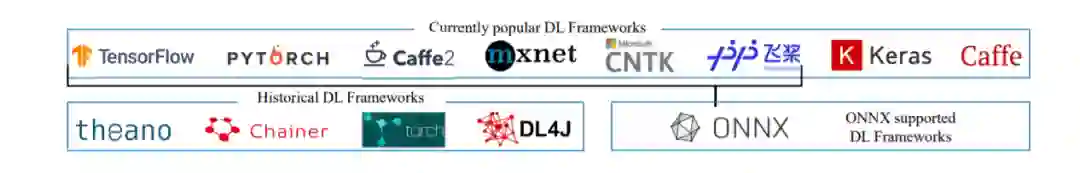 图1所示。DL框架景观:1)当前流行的DL框架; 2)历史DL框架; 3) ONNX支持的框架。