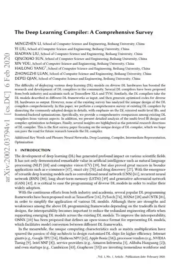 【导读】近年来深度学习芯片的研究发展是业界关注的焦点。专知之前报道过Google AI Jeff Dean独自撰文的关于AI时代芯片的历史发展趋势-【Google Jeff Dean独自署名论文】深度学习革命及其对计算机架构和芯片设计的影响,讲述AI芯片发展历程与未来,但学术业界一直缺乏对当前深度学习编译器框架的综述。最近北航的学者撰写了第一篇关于当下深度学习编译器的综述论文《The Deep Learning Compiler: A Comprehensive Survey》36页pdf107篇参考文献,从各个方面对现有的DL编译器进行了全面的比较。此外,还详细分析了多级红外设计和编译优化技术。最后,指出了DL编译器的研究方向,很好的论文。
