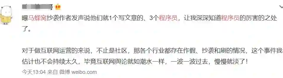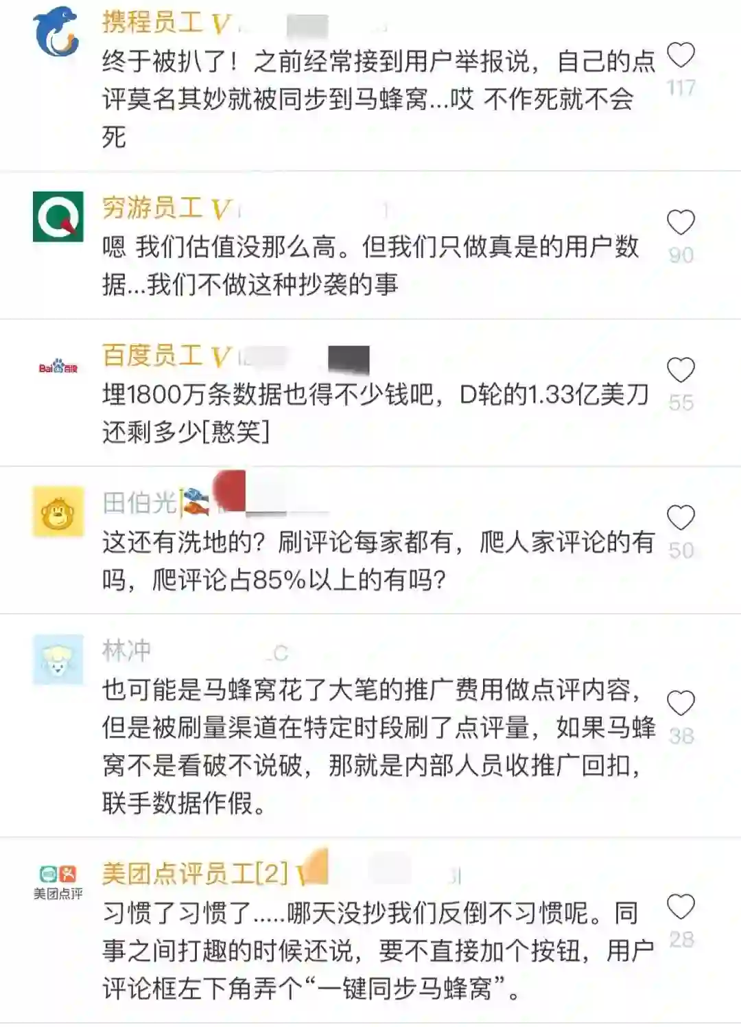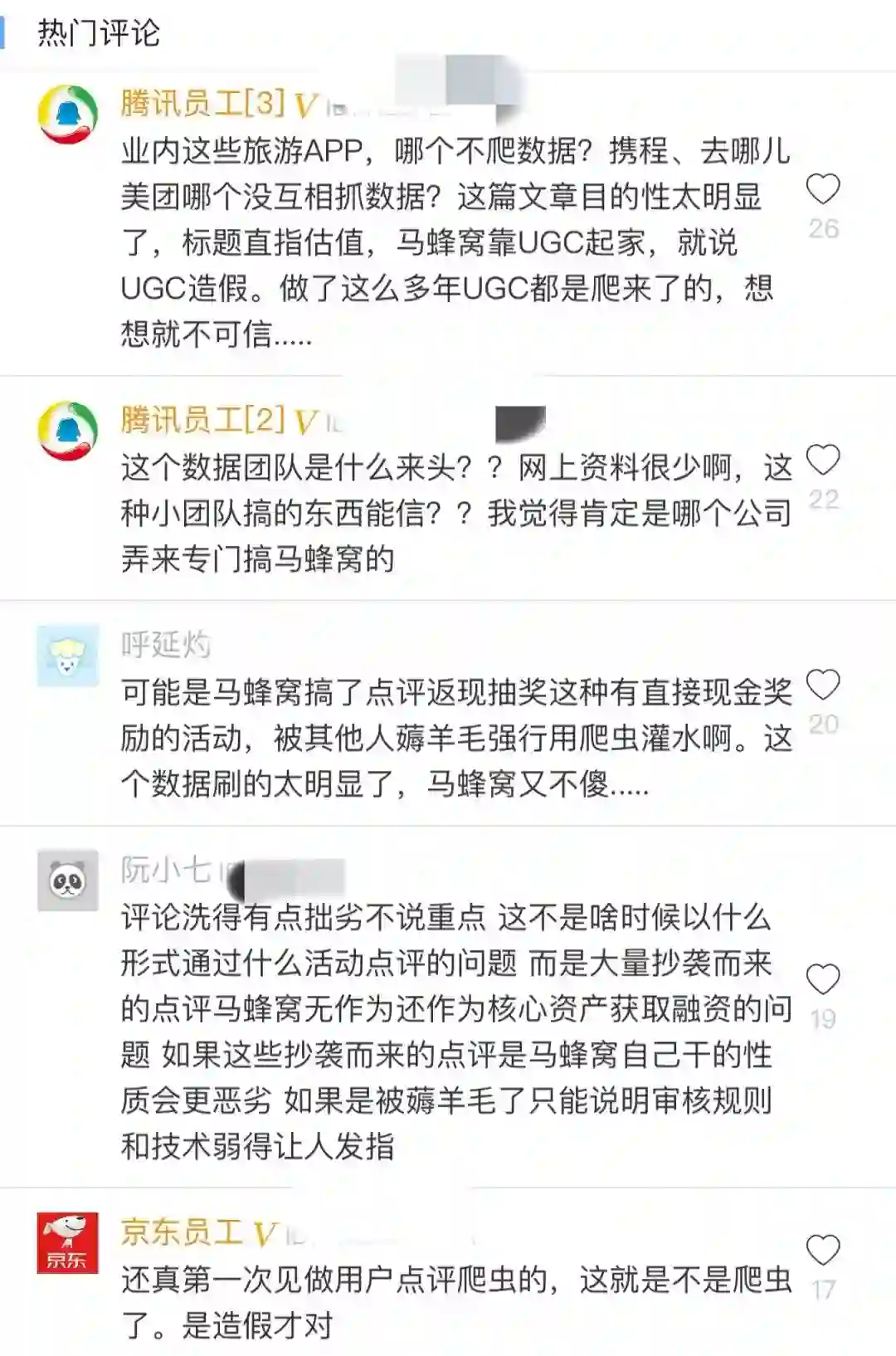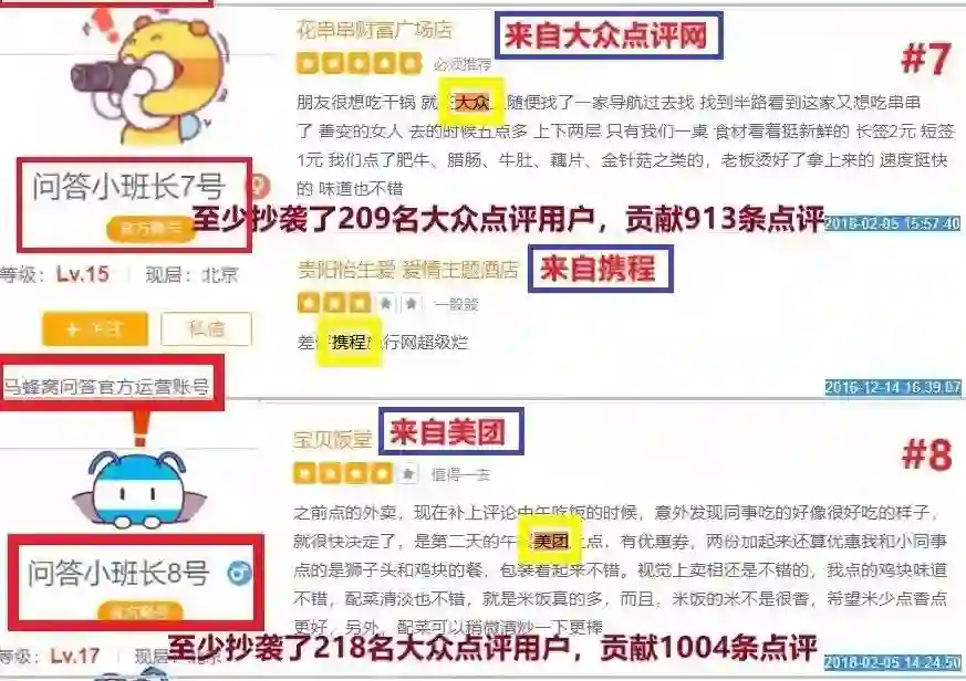 这篇文章中表示:“在马蜂窝网站上,发现了7454个抄袭账号,平均每个人从携程、艺龙、美团、Agoda、Yelp上抄袭搬运了数千条点评,合计抄袭572万条餐饮点评,1221万条酒店点评,占到官网声称总点评数的85%。”