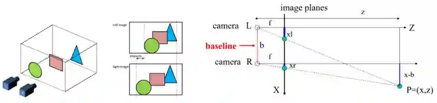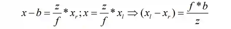 人的左右眼就如同图中的左右相机一样,分别获取对应图像后,通过大脑合成处理这种差异,从而获取真实世界的 3D 感知,通过图 1 右可得出视差与相机焦距和轴间距间的关系: