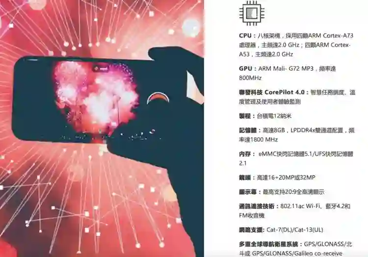 Helio P60 是联发科在 3 月份发布的一款 SoC,它采用了台积电 12 纳米工艺,CPU 为 4 个 A73「大核」加 4 个 A53「小核」,最高主频都是 2.0GHz,GPU 为 3 核的 Mali-G72,支持双卡双 4G 和主卡副卡同时 VoLTE 在线。此外,Helio P60 加入了一颗多核人工智慧处理器 APU,可以在面部识别、对焦上让手机拥有更优秀的表现。