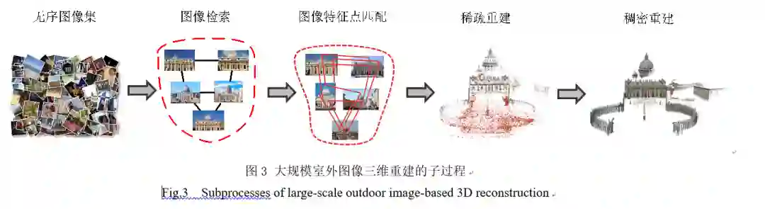 对于人类而言,通过视觉构建真实、准确、完整的三维模型是自然而然的事,但是在计算机程序中抽象出该过程却绝非易事。为了使大规模图像三维重建在计算机程序中可行,通用的方法是将重建分解为几个更小、更易处理的串行子过程。本文重点关注这些子过程中点云生成部分,如图3所示。对于后续的表面重建和纹理映射,本文不进行具体阐述。
