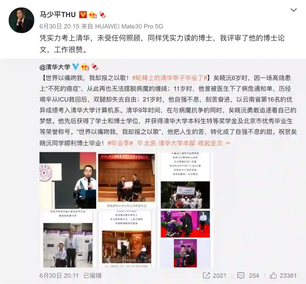 21岁,以云南省第16名、高考679分的成绩考入清华大学计算机系 ,成为我国改革开放后清华大学招收的第一个残疾学生;