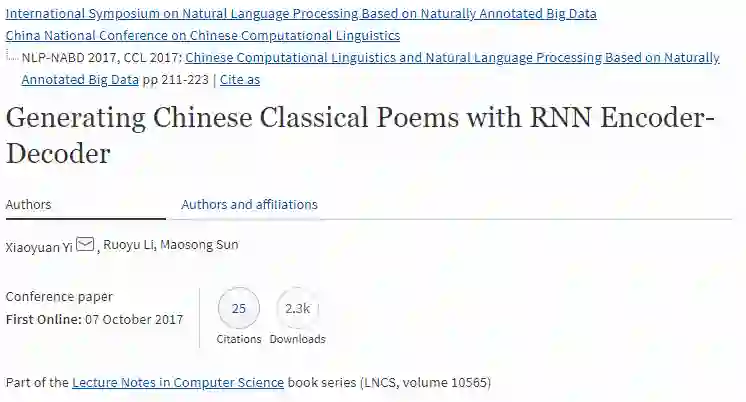 这篇论文介绍了,中国古典诗词的生成作为一个序列到序列的学习问题,并通过各种定性分析研究循环神经网络(RNN)对诗词生成任务的适用性。研究人员建立了一个基于RNN编码器-解码器结构的新型系统,以关键词为输入,可以生成四行诗,也就是常说的绝句。系统可以学习单句中的语义,诗中各句之间的语义相关性,以及利用结构、节奏和音调模式之间关联性,无需使用任何约束模板。实验结果表明该系统也优于其他竞争系统。