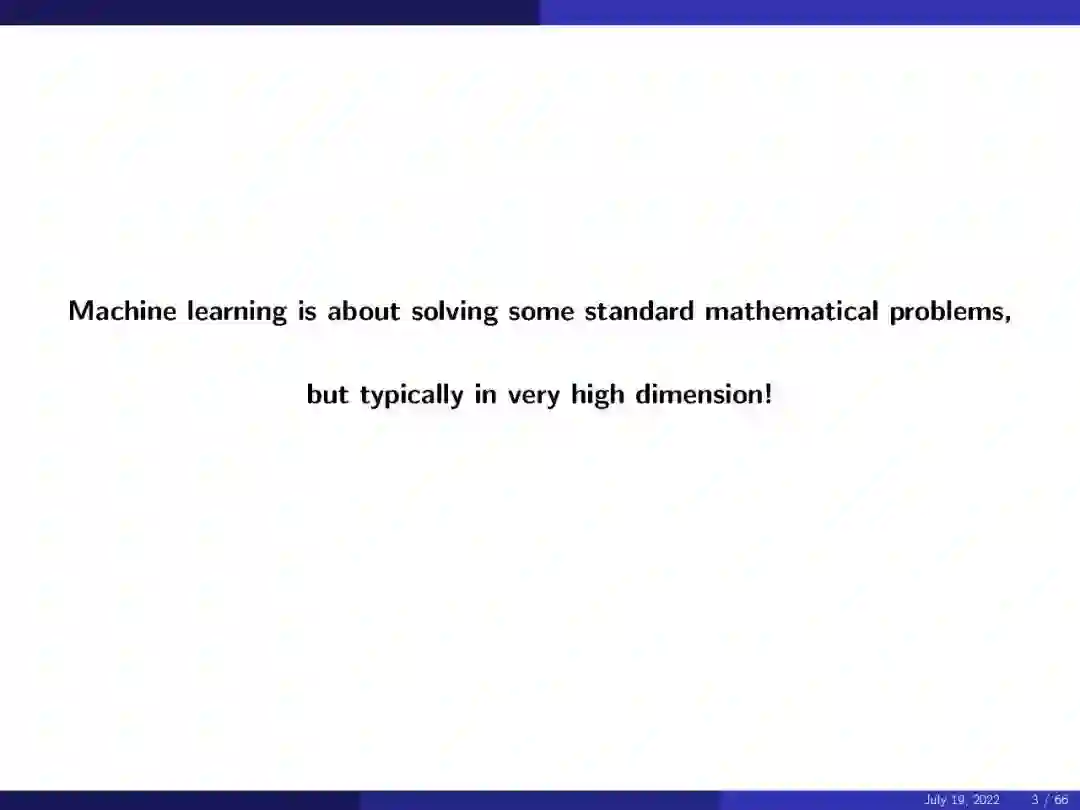 本演讲回顾了基于神经网络的机器学习数学理论领域的现状。他工作的中心主题是对高维函数的理解。他一开始就说,“机器学习是解决一些标准的数学问题,但是在非常高的维度上”。在数学的这个背景下,人们可以认为监督学习是使用有限的训练集逼近目标函数。使用图像分类的例子,我们感兴趣的函数是将每个图像映射到其类别的函数。我们知道函数在有限样本上的值(标签),目标是找到函数的精确逼近。
