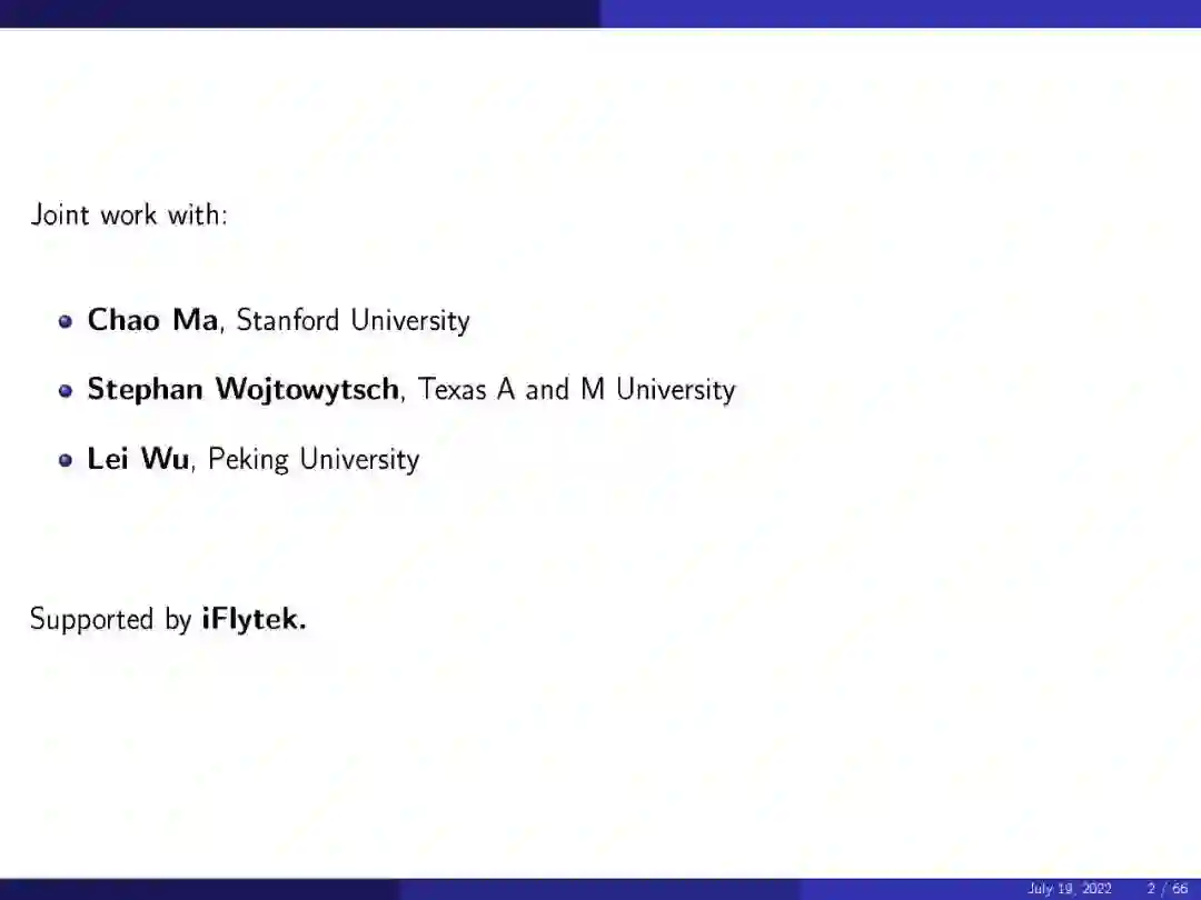 在他的演讲中重点讨论了一些关于基于神经网络算法的不同方面的证明,包括监督学习中的错误,随机特征模型,两层网络的近似理论,基于梯度的训练,以及在无监督学习中近似概率分布。