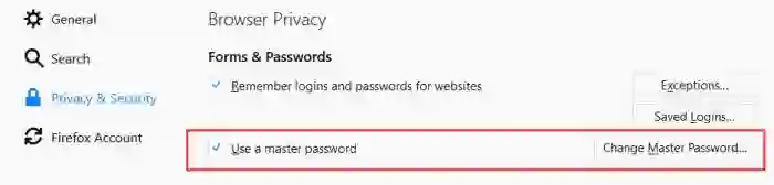 Firefox 向用户提供了一个可选的主密码系统保存浏览器记录的网站密码。但专家指出,Firefox 使用的加密方法不安全,很容易被暴力破解。AdBlock Plus 扩展作者 Wladimir Palant 表示他检查了源代码,发现加密功能使用 SHA-1 函数哈希一个由随机盐和主密码组成的字符串,SHA-1 函数只迭代一次,而行业标准是至少迭代一万次。