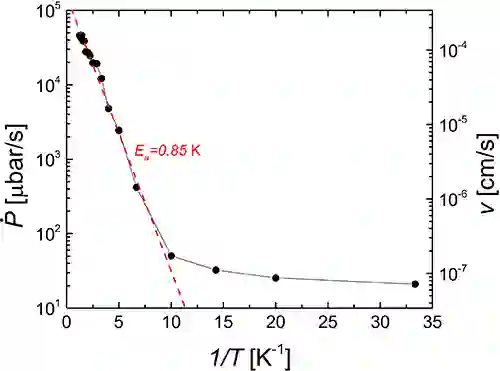 图 2. 压强上升速率(即质量流动速率)随温度变化的 Arrhenius 图。在100 mK以上,流动速率满足热激发过程;在100 mK以下,流动速率趋于饱和,预示质量输运进入量子区域。