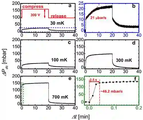 图1. 在不同温度下挤压应力导致的压强变化。(a) T = 30 mK; (c) T = 100 mK; (d) T = 300 mK; (e) T = 700 mK.(a)中红实线表示施加挤压的时间;(b)和(f)分别为(a)和(e)中虚线框的放大图。(b)中红虚线拟合压强随时间线性上升的行为,得到上升速率为 21 μbar/s。(f)中由于压强在2.5秒内已经饱和,因此估算上升速率为 46.2 mbar/s。