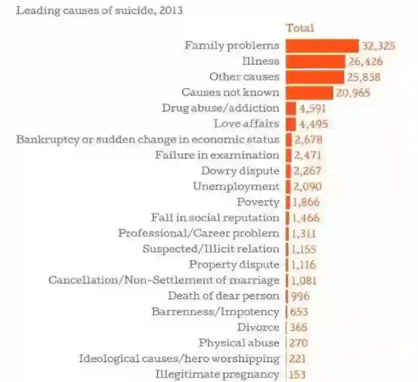 15岁至29岁的印度年轻人,其自杀率居全世界前列。2013年,每十万人中,就有30到40人自杀,占到所有自杀人群的三分之一。