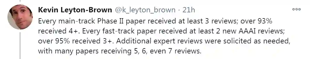 每篇主track的第二阶段的论文都至少收到3篇评审;超过93%的论文获得4+分。每篇快速track论文都至少收到两篇新的AAAI评审;超过95%的人获得3+的评审。根据需要还征集了其他专家评审,许多论文获得了5条6条,甚至7条评审。