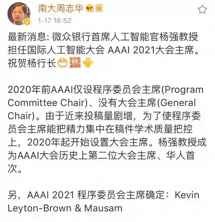 AAAI 的英文全称是 Association for the Advance of Artificial Intelligence——美国人工智能协会。该协会是人工智能领域的主要学术组织之一,其主办的年会也是人工智能领域的国际顶级会议。在中国计算机学会的国际学术会议排名以及清华大学新发布的计算机科学推荐学术会议和期刊列表中,AAAI 均被列为人工智能领域的 A 类顶级会议。