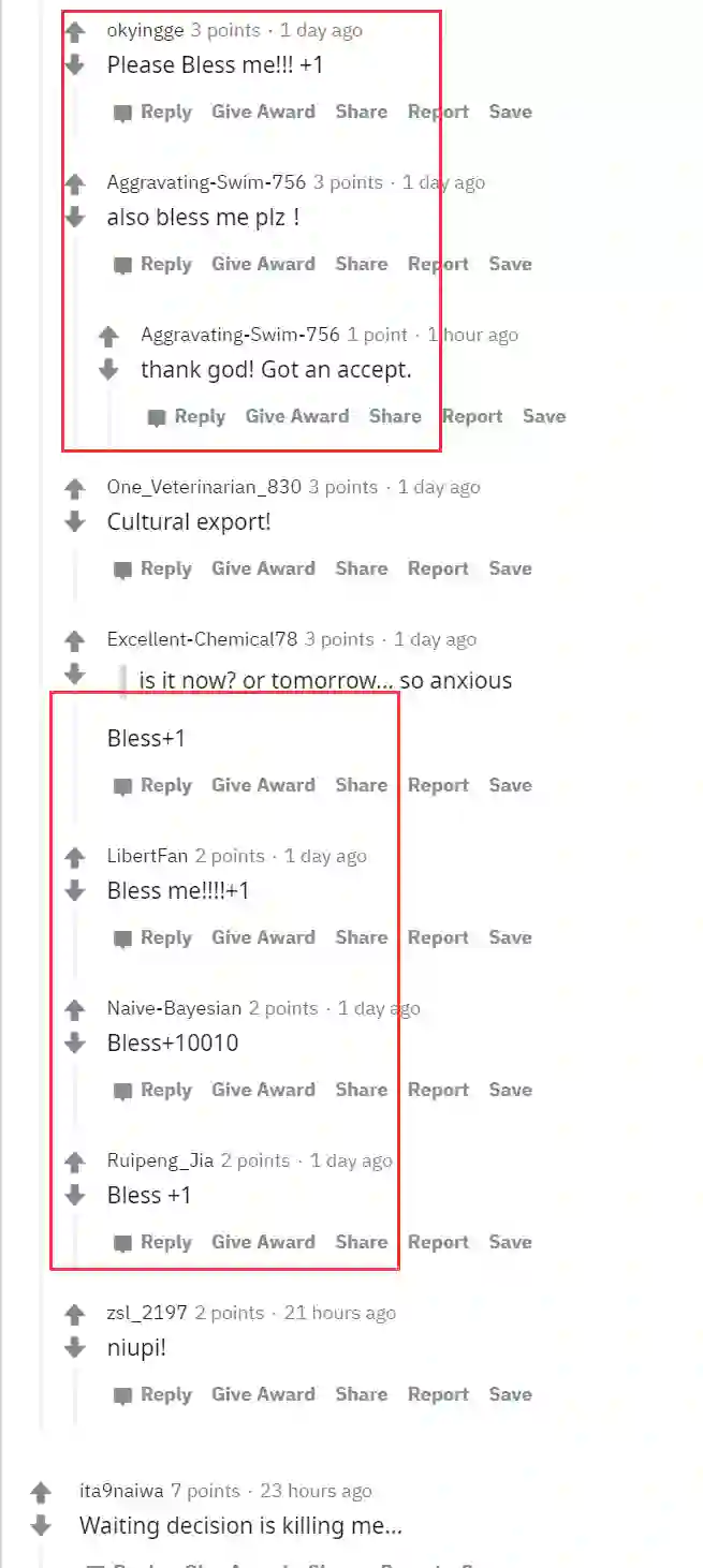 还是在AAAI 2021录取前夜,有热心网友在Reddit上题为 “AAAI 2021 Paper Acceptance Result"的一条贴子下惊奇地发现了“Please Chaoyue Yang bless me”的字样: