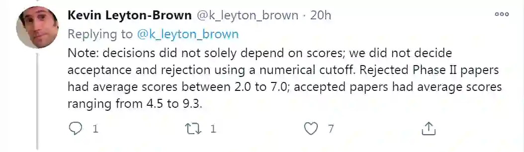 决定不仅仅取决于分数。我们没有使用数字临界值来决定接收或拒绝。被拒绝的第二阶段论文的平均分数在2.0到7.0之间,被接受的论文的平均分数在4.5到9.3之间。