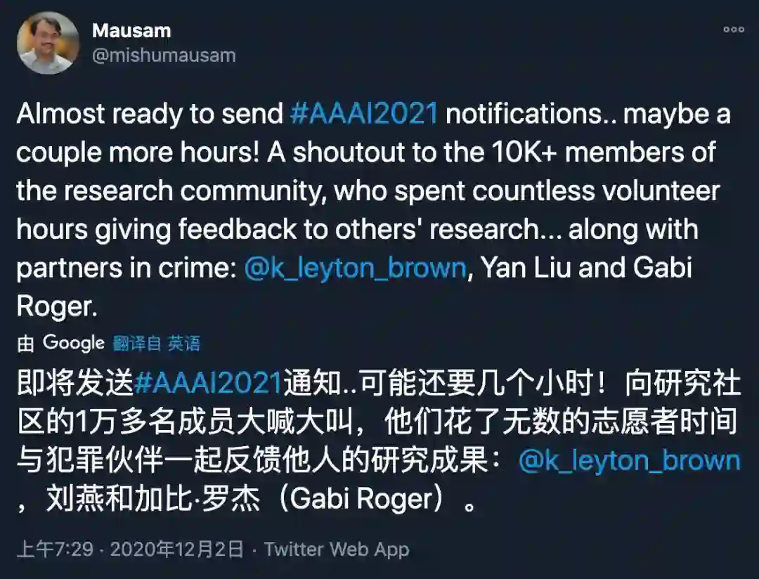 时间回到一天多前,按照AAAI之前官网的显示,大会应该在12月1日就应该发送录取邮件通知,而直到12月2日,大会的另一位程序主席Mausam才在推特上发文称还要等上几个小时。