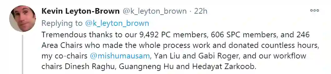 这也是为什么我们没有在当天早些时候做出论文录用决定的原因:我们花费大量时间单独查看数千篇论文并处理各种极端情况。我敢肯定,你们中的一些人仍然会不同意录用结果,但是我们竭尽所能公平对待每篇论文。