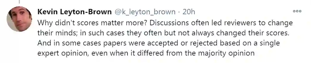 为什么分数并不重要?因为讨论经常导致审稿人改变主意;在这种情况下,他们经常改变分数。在某些情况下,即使是与多数意见不同,论文也只能基于一位专家意见被接收或拒绝。