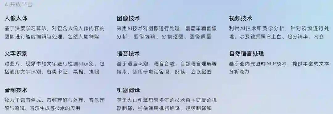 那么,有了这些字节跳动在AI技术上的深耕,火山引擎AI开放平台的能力自然也有了强力的保障。