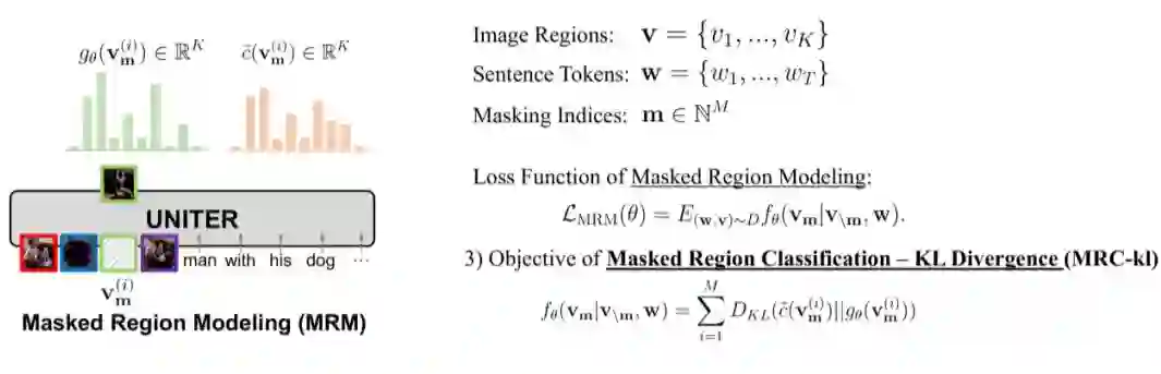在 Masked Region Classification-KL Divergence(MRC-KL)预训练任务中,同样是随机 mask region token,但是不同的这里不是做分类任务,而是需要计算 Faster R-CNN 特征和 Mask region 的分布差异,使得 Mask region 的分布和 Faster R-CNN 特征的分布尽可能相似,所以损失函数用的是 KL 散度。