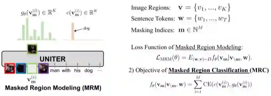 在 Masked Region Classification(MRC)预训练任务中,需要在 region token 中随机 mask 掉一些 token,然后根据其他的图片 token 和所有的文本 token 来预测这些被 mask 的 token。具体来说就是,每个 region 都会有 Faster R-CNN 得到一个 label,模型需要预测 mask token 的类别,使之和 Faster R-CNN 的 label 相同。