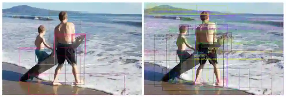 与 ViLT 不同,这篇文章认为目前预训练模型的瓶颈在于,目标检测器提取的特征不够好。如上图所示,左边是 BUTD 的检测结果,右图是本文提出的检测器的检测结果。作者通过在更大数据集上训练更好的目标检测器,并用该检测器提取特征,来提升了预训练模型的性能。