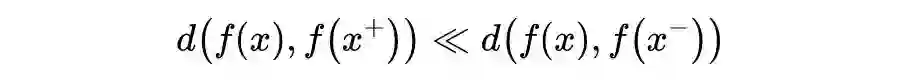CV 领域中,和“微调+预训练”模式比较接近的方法,应该就是对比学习。对比学习同样用的是没有标注的数据,也就是说数据集里只有图片而没有标签。对比学习的目标是学习一个编码器,此编码器对同类数据进行相似的编码,并使不同类的数据的编码结果尽可能的不同 。也就是说对比学习本质上其实就是用了聚类的思想:缩小与正样本间的距离,扩大与负样本间的距离 。如下面的公式所示: