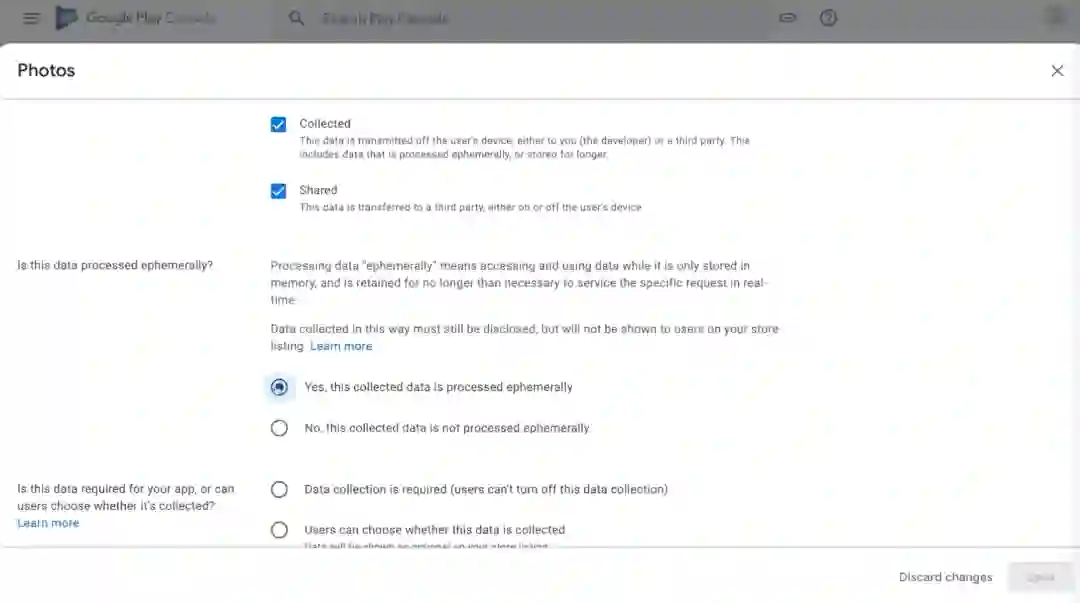 请注意,如果您在收集某组数据类型的同时有意收集另一种数据类型,则应同时披露两者。例如,如果您要收集用户的照片并利用其确定用户特征 (例如: 民族或种族),那么还应披露民族和种族的收集。另外一个例子是,如果您通过 IP 地址确定设备的地理位置,那么您也需要声明位置信息这一数据类型。