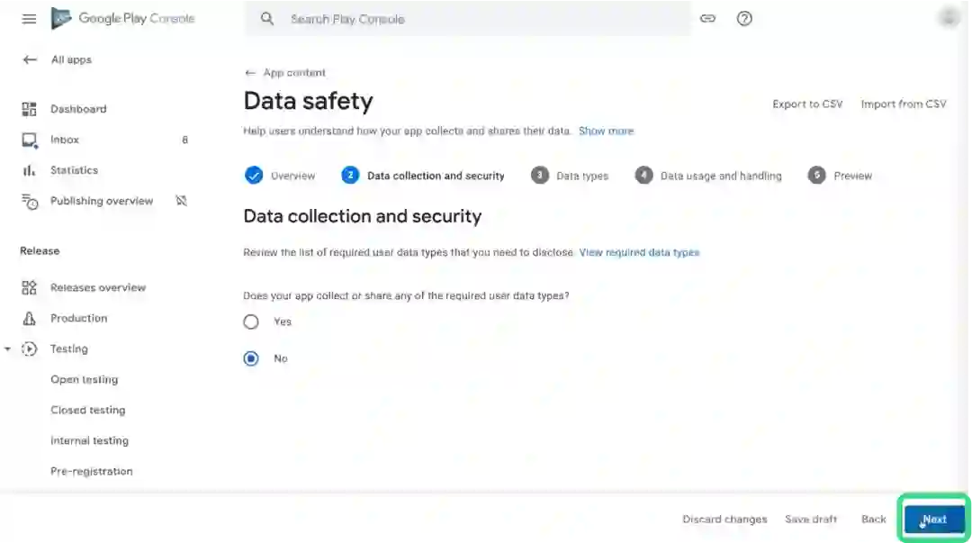 正确选择所有应用收集或分享的用户数据类型后,请点击下一步。