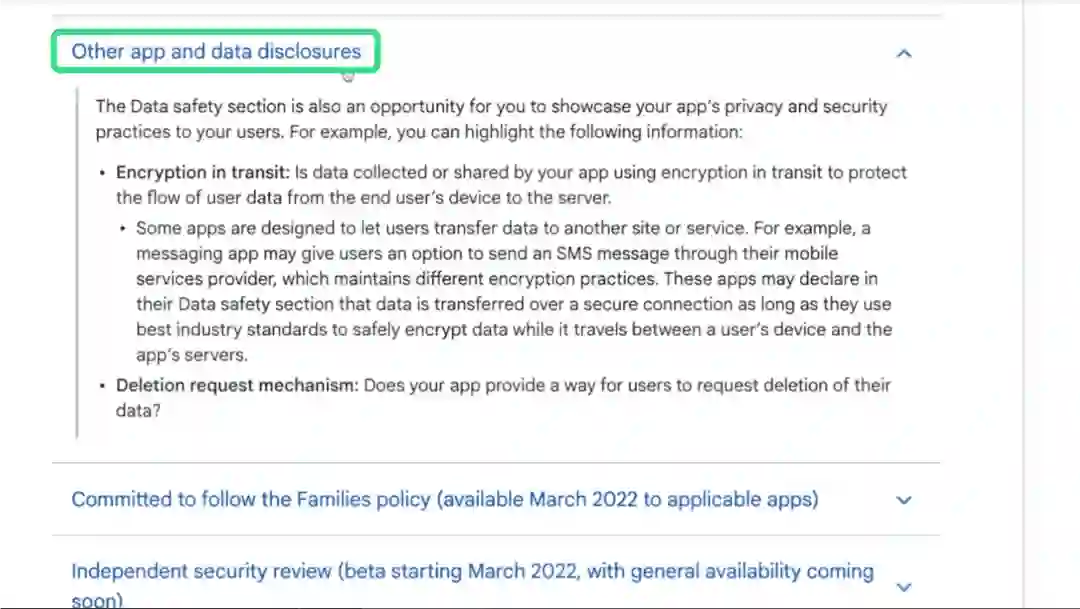 如果您在应用中集成了 SDK,请联系 SDK 开发者或通过此类公开信息了解 SDK 是如何处理终端用户数据的。这能帮助您更好地回答 Google Play 数据安全表单中关于应用的终端用户数据收集、分享和安全做法的问题。