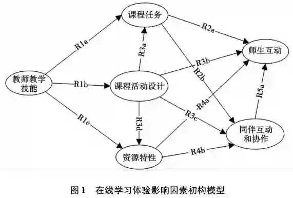 依据上述模型,可得出影响因素间的12个关系。分别是:R1a教师教学技能对课程任务有正向显著影响;R1b教师教学技能对课程活动设计有正向显著影响;R1c教师教学技能对资源特性有正向显著影响;R2a课程任务对师生互动有正向显著影响;R2b课程任务对同伴互动和协作有正向显著影响;R3a课程活动设计对课程任务有正向显著影响;R3b课程活动设计对师生互动有正向显著影响;R3c课程活动设计对同伴互动和协作有正向显著影响;R3d课程活动设计对资源特性有正向显著影响;R4a资源特性对师生互动有正向显著影响;R4b资源特性对同伴互动和协作有正向显著影响;R5a同伴互动和协作对师生互动有正向显著影响。