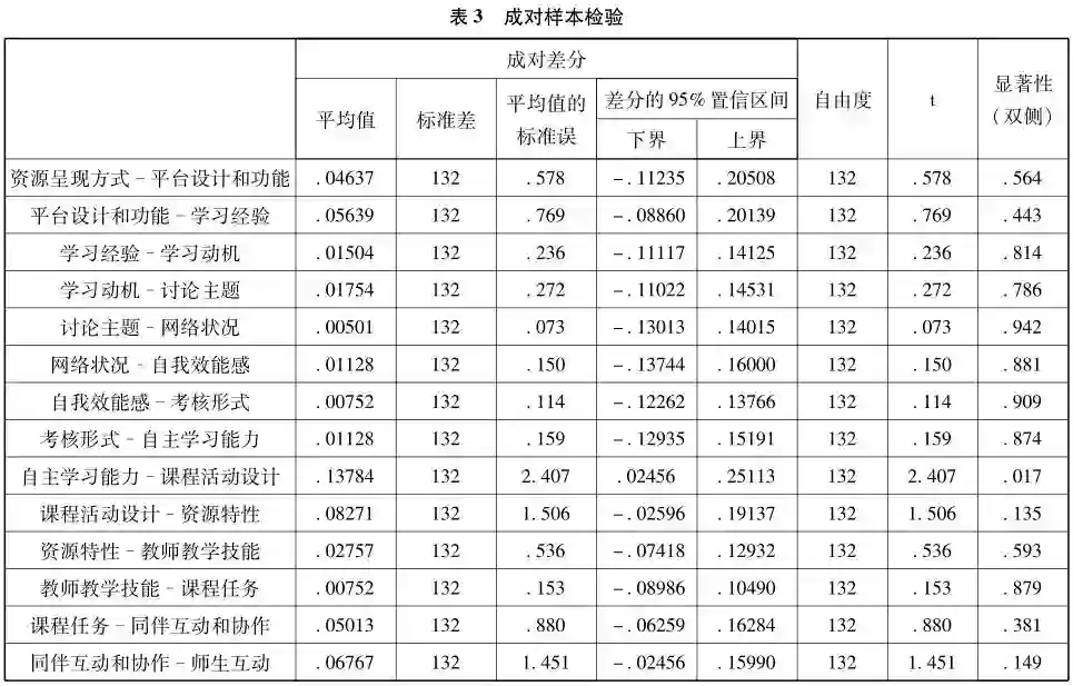为明确区分影响在线学习体验的次要因素和关键因素,还需进行成对样本检验。按平均值从小到大依次成对,由SPSS软件输出成对样本检验的结果如表3所示。由表3可知,自主学习能力与课程活动设计一组的显著性p值是0.017,有显著差异。因此可以确定影响在线学习体验的关键因素是师生互动、同伴互动和协作、课程任务、教师教学技能、资源特性和课程活动设计,其余均为次要影响因素。