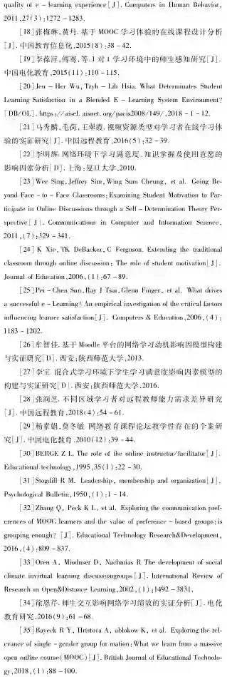 国内外涉及在线学习体验影响因素的相关成果主要有:Young B J研究了学习者之间的个体差异(包括意愿和动机、自控能力、决策能力、技术能力等)对网络学习体验的影响情况[6];Kyung-Sun Kim等探究了信息素养、学习方式、师生及同伴互动对在线学习体验的影响,结果显示师生及同伴互动、信息素养可显著预测学生的在线学习体验,而学习方式对在线学习体验没有显著影响[7],Maier等通过对2196名学习者的网络体验进行调查后提出,其影响因素主要包括网络学习环境、网络学习资源、个体学习过程、师生及同伴互动、网络学习效果等[8]。Douglas Colbeck等调查了合作学习对在线学习体验的作用,探究如何设计适宜的合作学习活动以提高学生的线上体验[9]。刘斌等通过文献研究系统地讨论了网络学习体验影响因素间的结构关系,提出网络学习体验的关键影响因素主要有学习环境、活动设计、教师(助教)、学生主体和互动行为[10],但并未利用数据加以佐证。山峰等运用问卷调查、访谈及日志分析的方法对影响艺术类专业学生在线学习体验的各类因素进行了研究[11]。李佳赟以问卷形式对学生的基本信息、个体学习风格、平台体验、活动体验和学习效果进行了调查,以此来探究学生在MOOC课程中的体验情况及学生的基本特征、学习风格和学习体验三者间的关系[12]。