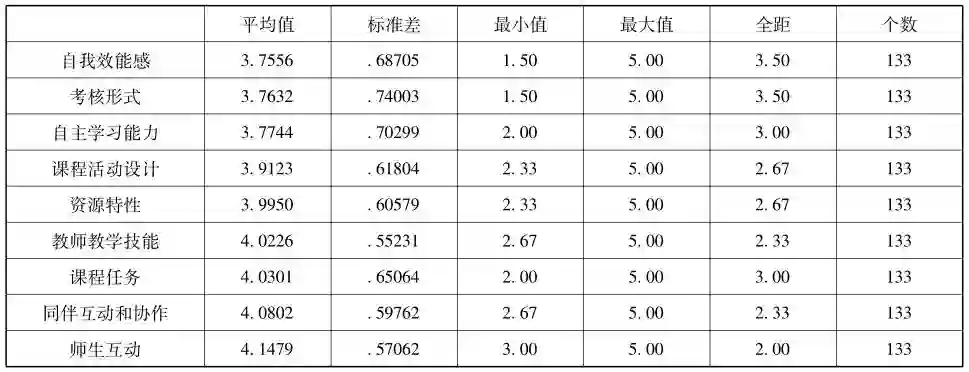 对收集到的141份问卷进行筛选,排除无效问卷后共获得133份有效问卷。接着采用cronbach’s Alpha系数对问卷的信度予以检验,结果显示,问卷整体信度Alpha系数值是0.933,每个维度信度Alpha系数值都在0.714至0.876之间,表明问卷在整体和各维度上都有较好的信度。关于问卷的效度,在此主要采用了探索性因子分析来检验问卷的建构效度。首先,以每个层面的KMO值和Bartlett显著性概率值来判断是否可以进行因素分析。在确定了所有层面的KMO值都超过0.745和Bartlett显著性概率值全部达到显著的基础上,运用限定抽取共同因素法,分别把每个层面的所有题项均选入到程序中。通过萃取共同因素,并依据输出的“旋转成分矩阵”表来判断各因素所含题项与原问卷题项是否一致。在完成信效度检验后,学习经验、学习动机、自我效能感、平台设计和功能、自主学习能力五个因素所含题项中均有一题被删除,最终确定的问卷第二部分包含38道题项。此时问卷整体具备了较好的信效度,可以对其进行分析。