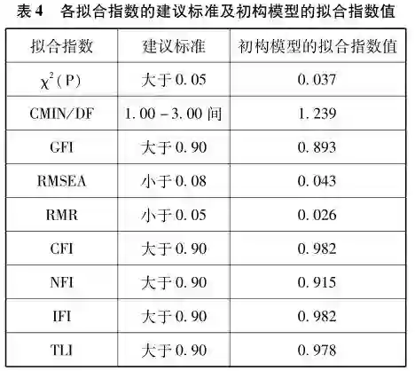 模型的拟合指数用来判断前面所建立的初构模型与所得数据的一致程度。拟合指数值是否达到标准一般由绝对拟合指数与增值拟合指数来判断,具体包括X2(p值)、CMIN/DF、GFI、RMSEA、RMR、CFI、NFI、IFI、TLI等。各拟合指数值的建议标准及由Amos输出结果得到的初构模型拟合指数值如表4所示。