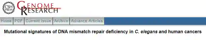 此外,研究人员从215例人结直肠癌和289例胃腺癌中提取的标记物揭示出了三个与MMR相关的标记物,其中一个与秀丽隐杆线虫MMR谱非常相似,并且强有力地区分微卫星稳定和不稳定肿瘤。人和秀丽隐杆线虫MMR缺陷的一个特征性差异是秀丽隐杆线虫中缺乏升高水平的NCG > NTG突变,这可能是由于线虫中不存在胞嘧啶(CpG)甲基化引起的;另外两种人的MMR特征可能反映了MMR缺陷与其他诱变过程之间的相互作用,但其确切原因仍不清楚。