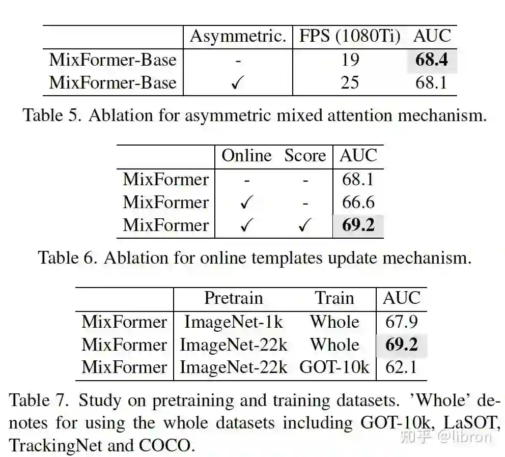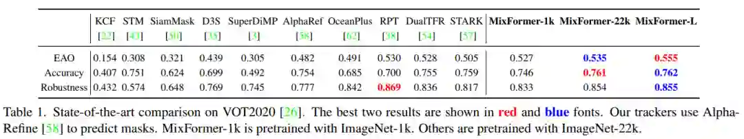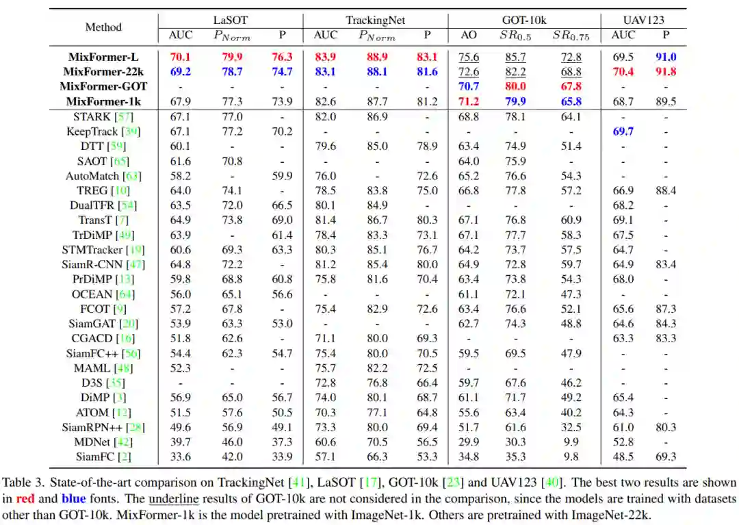 - 为了检验 mixformer 的泛化性能,我们在不同的 pretrain 模型和数据上进行分析,只在 ImageNet-1k 上 pretrain 的 mixformer 依然超越了此前的所有 sota tracker。