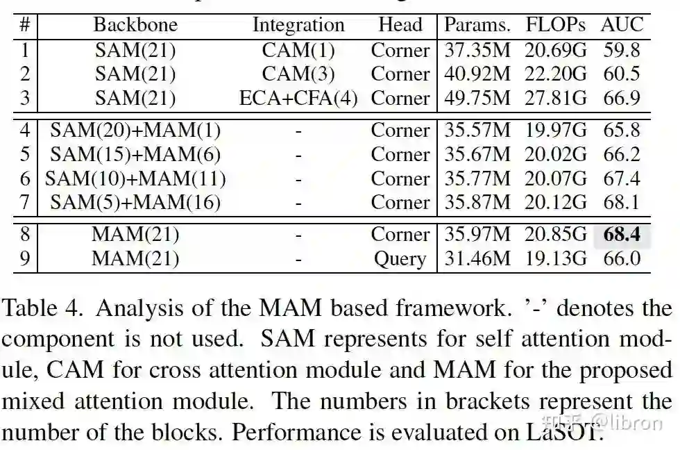 - 在不改变 attention 个数的情况下,我们将部分 MAM 替换成了 template 和 search 各自做 self-attention,也即没有了信息的交流。我们发现不同层次进行 MAM 会得到更好的性能,这更加说明了 extensive target-aware feature extraction and hierarchical information integration 是十分重要的。