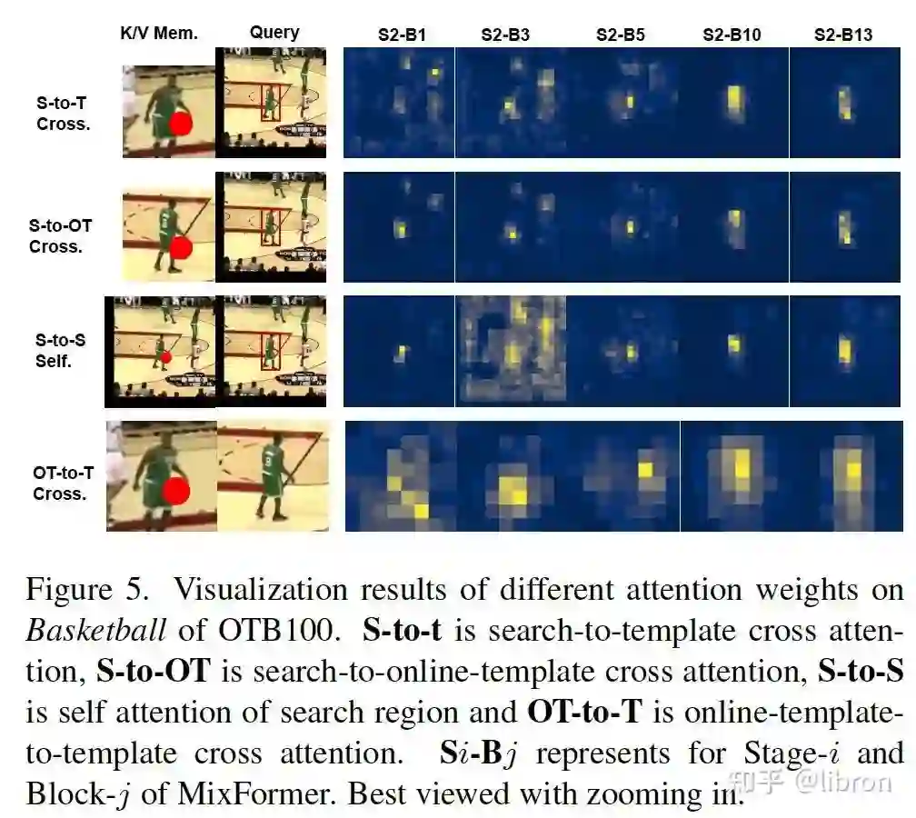 混合注意力模块(MAM)是我们框架中的核心设计,它的输入是 template 和 search area拼接 的 token sequence。因为我们希望能够同时做到特征提取和特征融合,所以不同于原始的 Multi Head Attention,MAM 首先会将输入 split 成 template 和 search area,然后同时进行 self-attention和 cross-attention。此外,我们采用了一种非对称式混合attention:删去了从 target(模板) 到 search (搜索区域)的 query ,这样做既是为了避免目标模板被动态的搜索区域影响,更重要的是能提高跟踪效率。因为target不受到search变化的影响,这样的话就可以将多个模板存为memory,不需要每帧search变化的时候重新生成。具体的实现细节可以参考我们的论文。