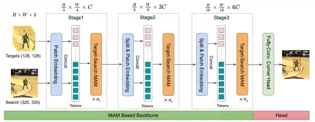网络结构只有两个模块,一个是基于本文提出的mixed attention module (MAM)的骨干网络用来提取和融合特征,最后连接一个预测头进行定位。feature map 呈现金字塔型变化,即随着网络的加深,分辨率逐渐变小,通道数逐渐增大。MixFormer是一个端到端模型,所以没有任何框后处理操作。