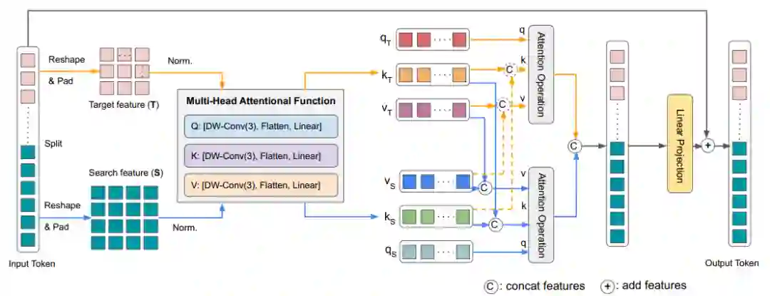 目前视觉跟踪领域流行的 tracker 范式通常是多阶段的 pipeline,主要包括三个组件:(1)CNN backbone 提取 target 和 search area 的特征;(2)一个独立的融合模块来实现 target 和 search area 间的信息交流,使得能够做到 target-aware localization;(3)一个预测头 tracking head 来精确定位目标,估计 bounding box。其中特征融合模块通常是跟踪算法设计的关键,传统的方法中主要使用基于互相关(correlation)的操作(如 SiamFC, SiamRPN, SiamFC++)以及在线更新的方法(如KCF, ATOM, DiMP, FCOT等)。近来受 tranformer 在视觉领域的启发,基于注意力机制的信息融合方法被引入,并取得了非常有效的效果(如 TransT, STARK, TrDiMP, TREG等)。