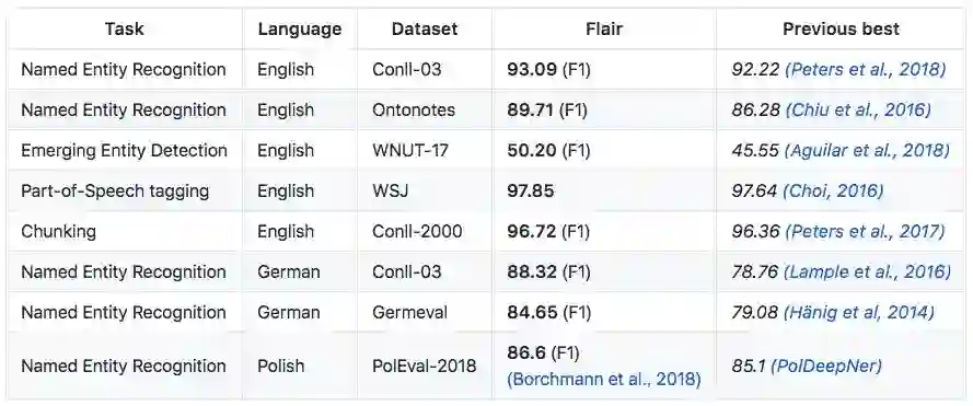 Flair 在多项 NLP 任务上优于之前的最优方法: