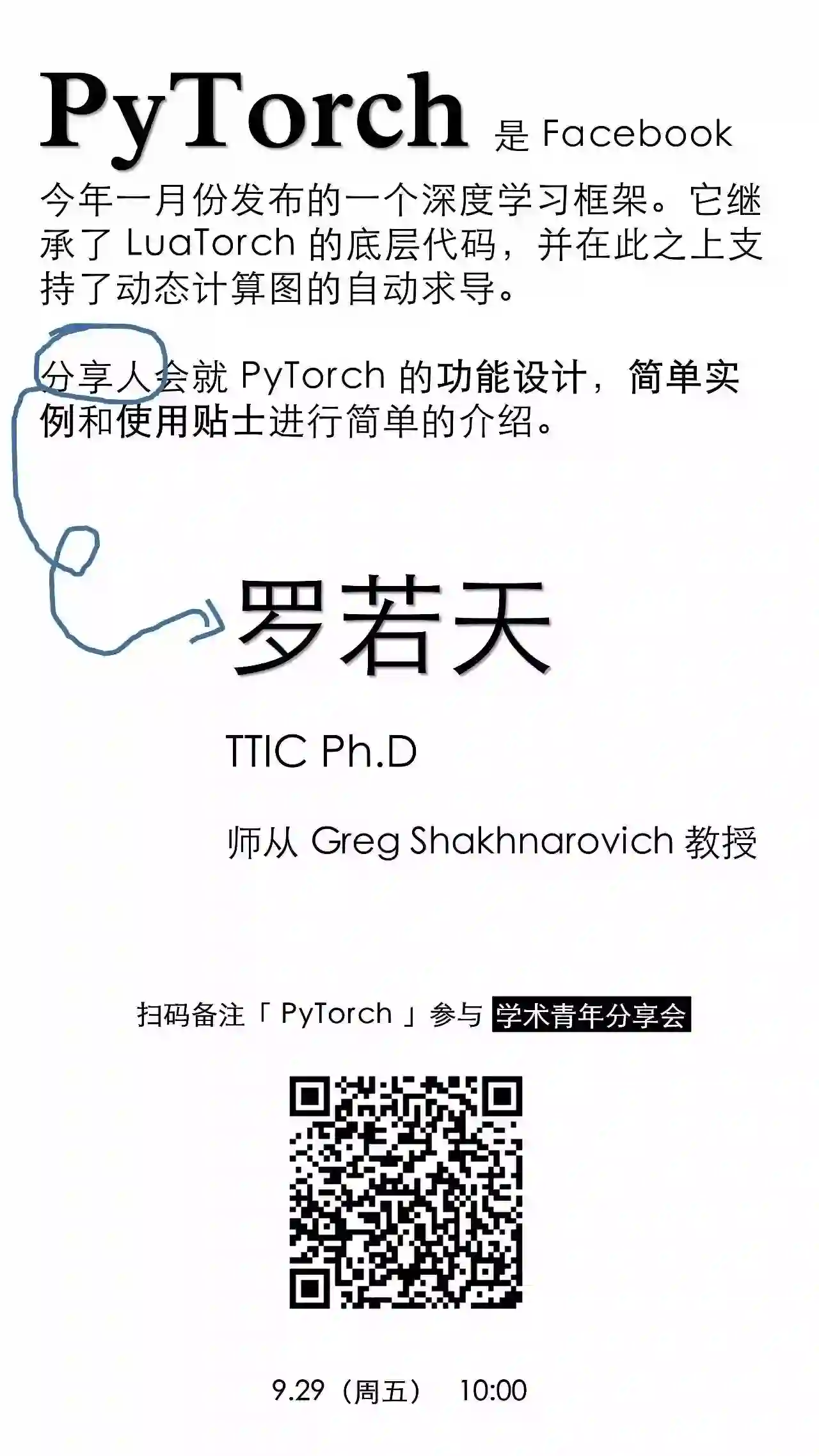 罗若天,TTIC三年级博士生,导师Greg Shakhnarovich教授。 他的研究兴趣在于计算机视觉及自然语言处理交叉。 在此之前,他于2015年在上海交通大学IEEE试点班获得计算机科学学士学位。 他曾在Adobe Research实习。他从二月份开始使用PyTorch并在此之后自来水安利PyTorch。